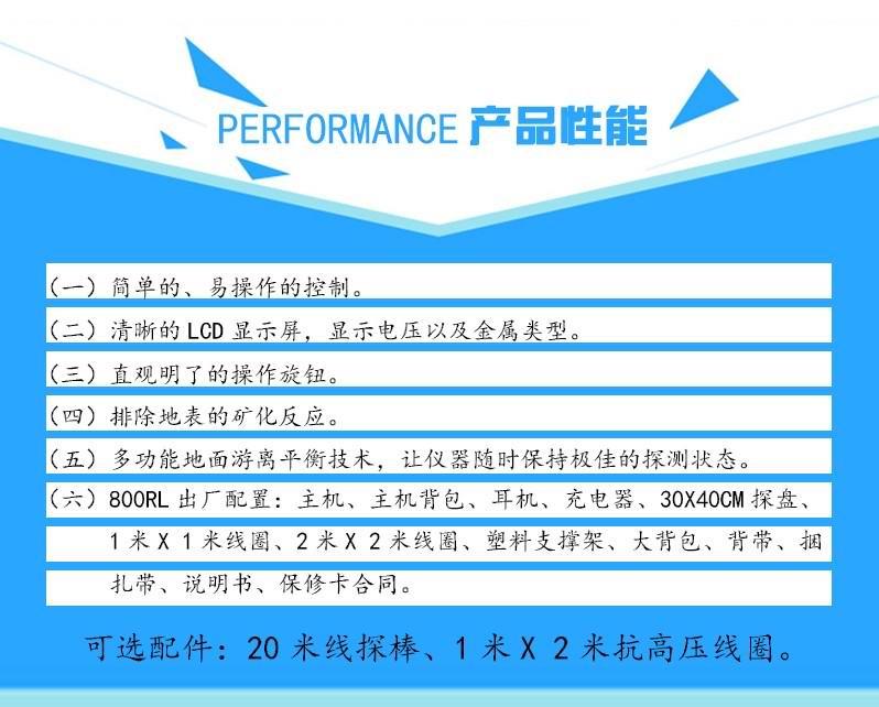 800RL電路上面設(shè)計(jì)一套自動(dòng)游離平衡技術(shù),讓機(jī)器傳送到線圈里面的脈沖電流不斷的根據(jù)地質(zhì)的解電量進(jìn)行游離行走,自動(dòng)調(diào)整檔位。大大的解決了使用中不穩(wěn)定亂叫這一難題,800RL還根據(jù)特定客戶的需求研制出專用的抗高壓線圈探盤,可以任意在高壓,特高壓電線下面進(jìn)行探測(cè)作業(yè)。