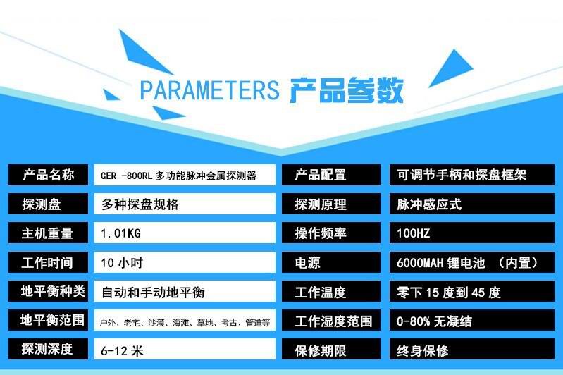 高性能,多用途,內(nèi)置的微處理器可以使它具有很高的靈敏度和地面平衡控制能力,尤其是在大深度窖藏探測(cè)上,在惡劣條件下的遺跡探測(cè),可以通過調(diào)節(jié)深度旋鈕來控制恰當(dāng)?shù)撵`敏度,排除不必要的干擾;GER-800RL可以選配多種尺寸的探盤,適用于各種不同的復(fù)雜環(huán)境,100HZ的工作頻率在確保穩(wěn)定工作的同時(shí)可以達(dá)到極深的探測(cè)深度。